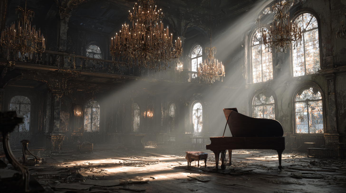 Their flashlights swept over peeling wallpaper and faded gold moldings that still shimmered faintly. They moved toward the piano. On the stand lay sheet music titled “The Waltz of Forever.” Liam tapped a key, and the faint echo rang through the room like a memory trying to return. Nearby, a champagne glass sat perfectly upright on a small table, its contents long evaporated but unbroken.