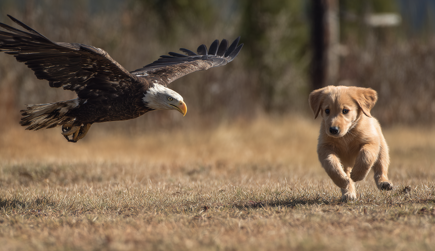 Soaring high above the rooftops was a huge golden eagle, its wings glinting in the sunlight. Then, without any warning, it dove—straight down toward one of the backyards. In an instant, its talons locked around something small and white on the grass. Before anyone could react, the bird lifted off again, carrying a tiny puppy into the sky. For a few stunned moments, the world seemed to stop. It felt like a scene from a nature documentary, except it was unfolding right there above their neighborhood.
