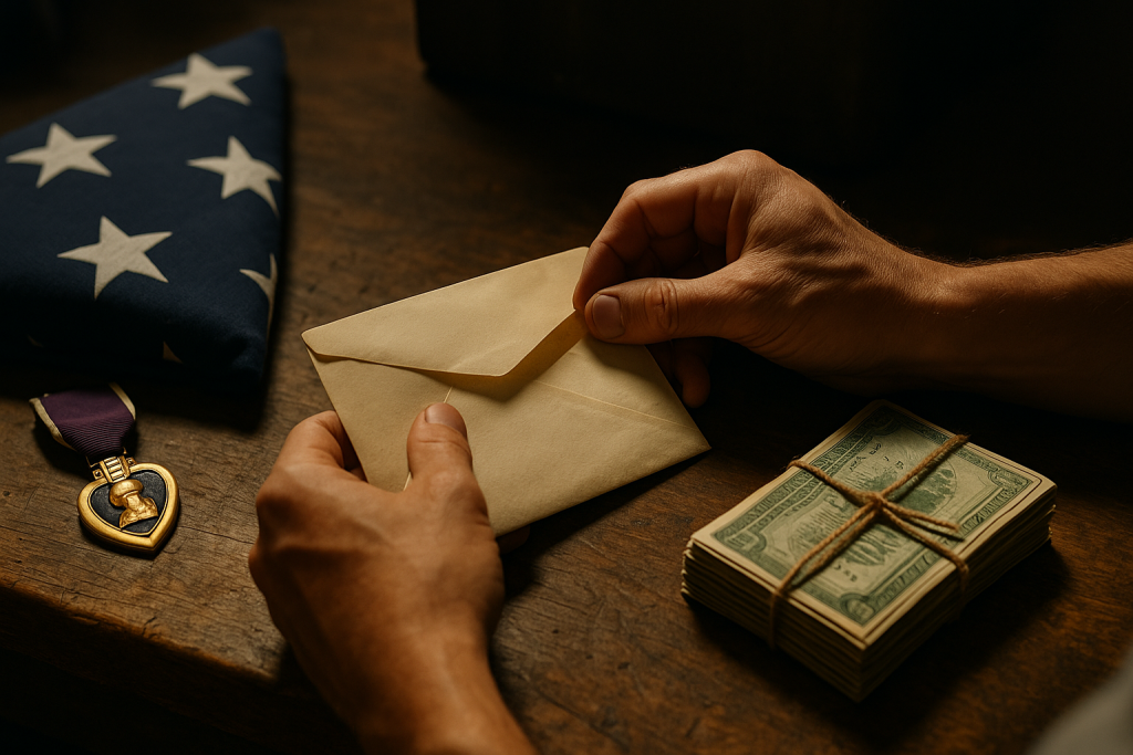 He slid a butter knife under the flap of the first envelope. The paper crackled as he unfolded it. The letter inside was written in neat cursive: “If you are reading this, I did not make it home.” The ink had bled slightly, but the words were steady. Beneath the letter was a folded piece of blue fabric dotted with white stars, and on top of it lay a medal that caught the light like a heartbeat. Nate swallowed hard. The room felt completely still.